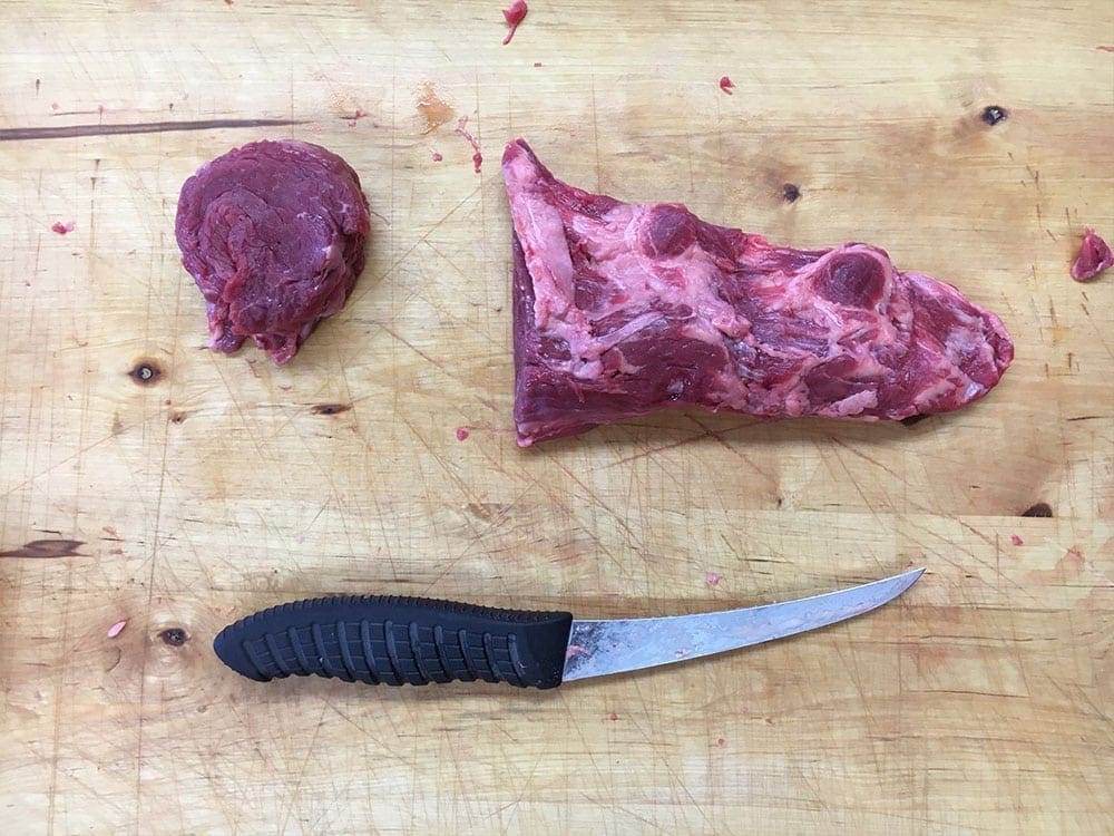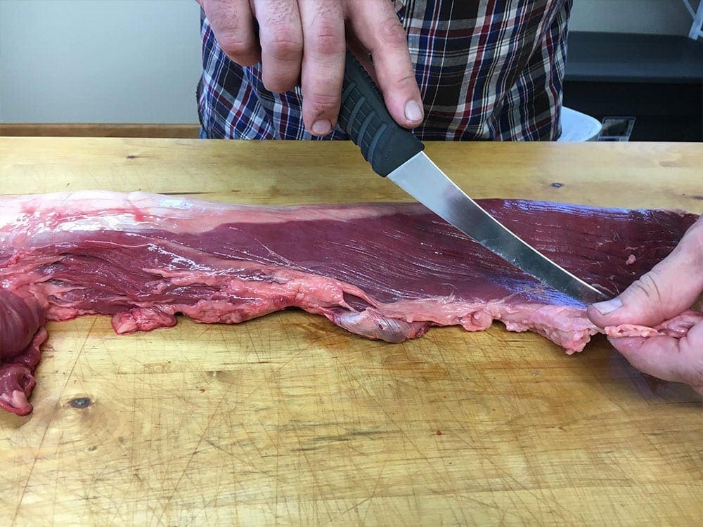 - Be sure to use a sharp knife and keep as much meat as possible, but remove all the fat and connective tissues!