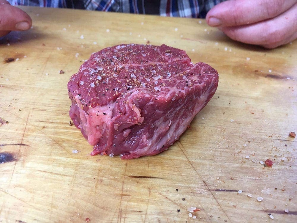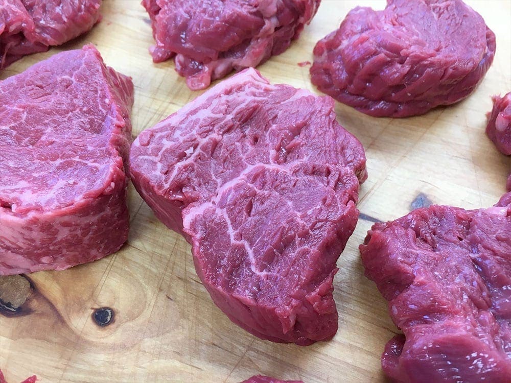 The end pieces will be flat and won’t look much like a filet. The trick to fix that is fold the somewhat flat cuts into a circle, then wrap it with a piece of bacon and secure the steak together with a couple tooth picks. It will cook up and taste just like the center cut steaks