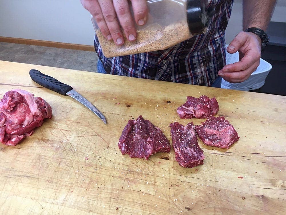 The center cut steaks are the classic looking filet. We recommend cutting a minimum of 1.5″ thick and we cut them up to 3.5″ for our King Cut line. (King Cut is a 16oz Filet) Make sure to trim any remaining connective tissue, there won’t be much at this point.
