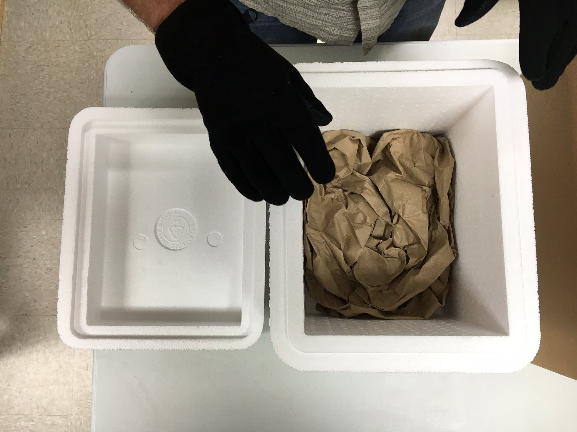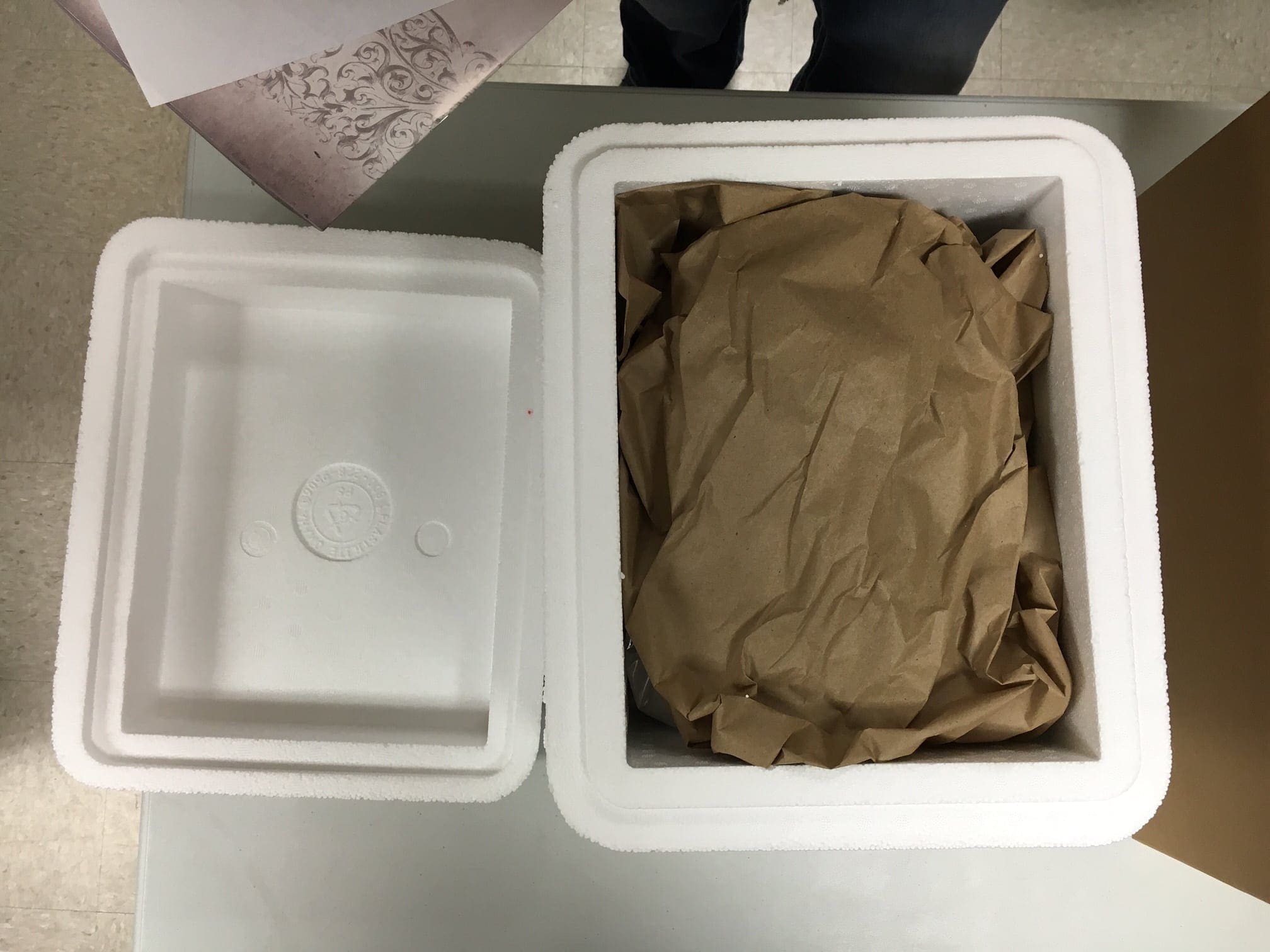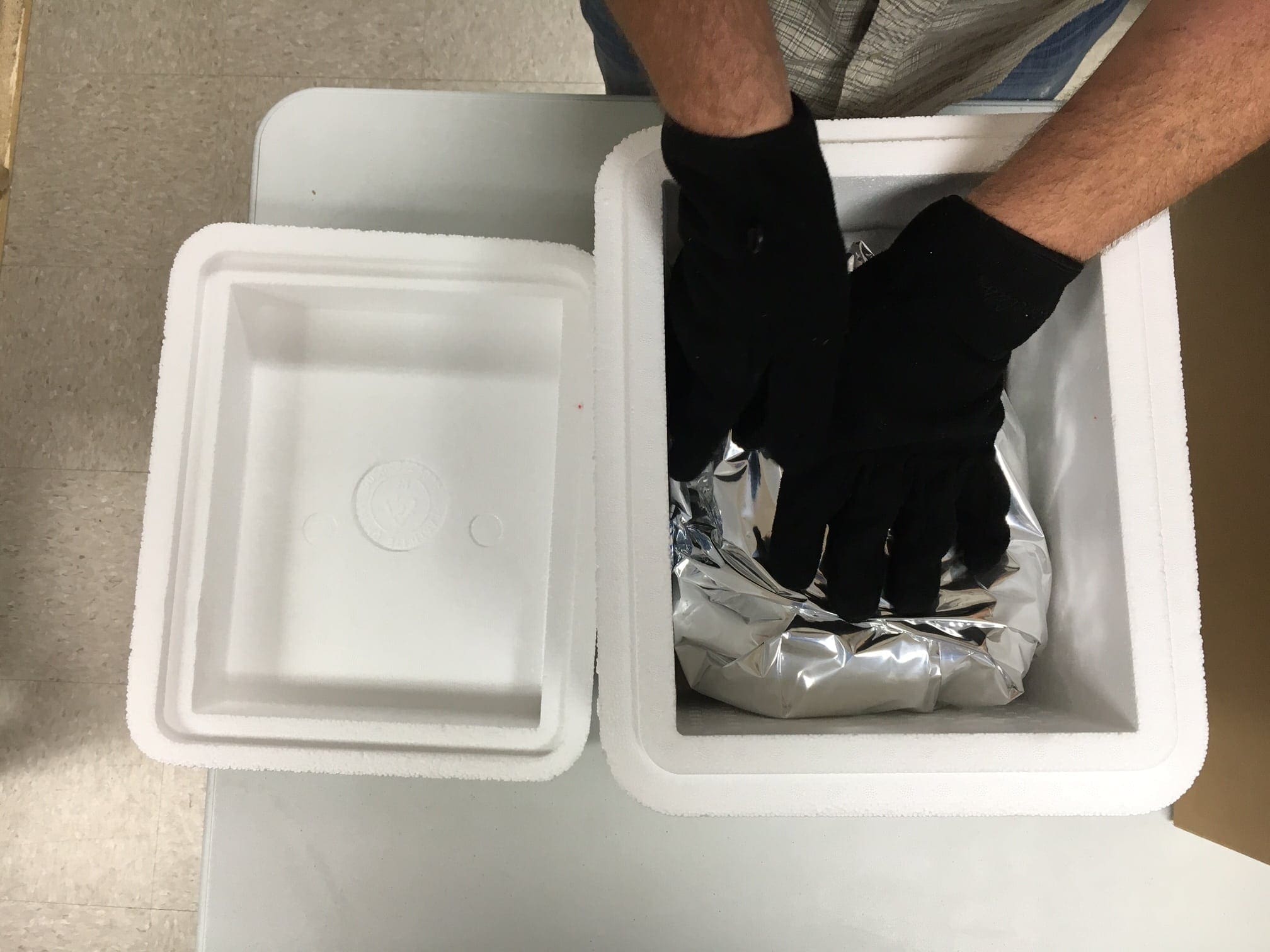 - Dry ice warning and a catalog are added on top of that and the cooler is taped shut securely